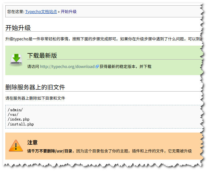 虽然不算复杂,但是如果对方是个新手博主的话,还是有点局促的。升级指南这里极力强调升级typecho是一件非常轻松的事情,但是全程仍然需要手动删除文件夹,手动上传文件进行解压,实际体验并不算丝滑的说。